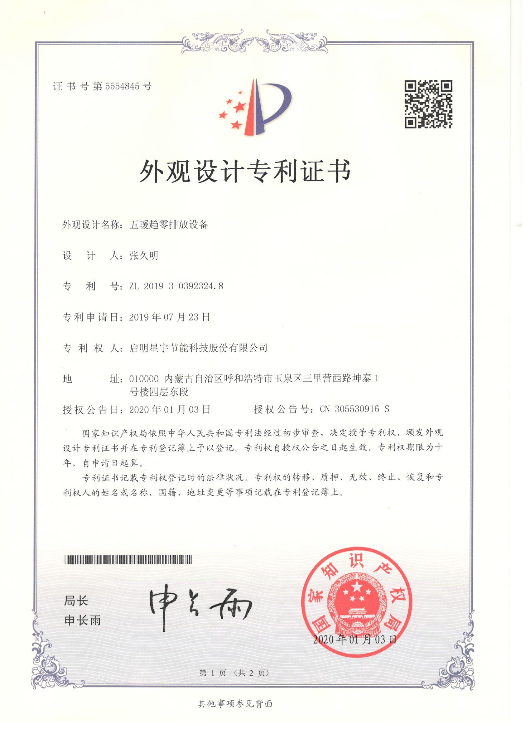 五暖趨零排放設(shè)備外觀設(shè)計專利證書