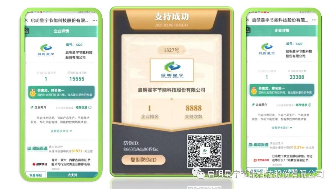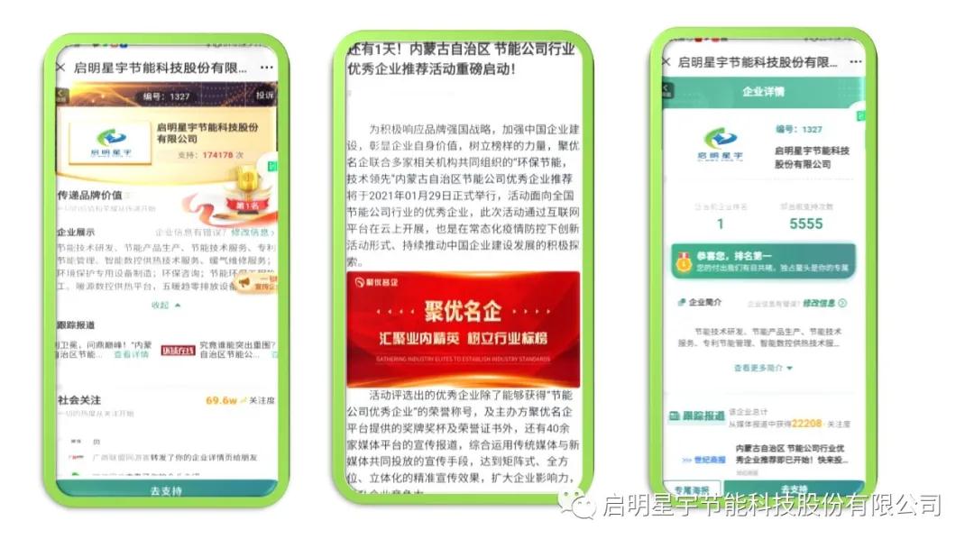 啟明星宇投票領先第二名83229票、領先第三名213521票,一舉奪得內蒙古自治區節能優秀企業皇冠!